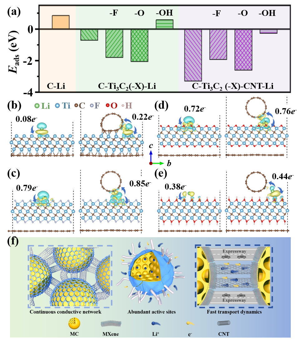 图3(a)Li在碳层上的吸附能,C-Ti3C2(-X,X=F,O,OH)和C-Ti3C2(-X)CNT;(b-e)Li与C-Ti3C2、C-Ti3C2F2、C-Ti3C2O2和C-Ti3C2(OH)2基底之间的电荷密度差和电子转移。黄色和青色区域分别表现出电子聚集