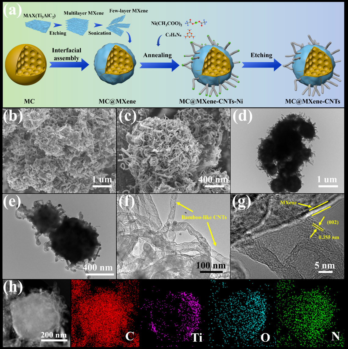 图1(a)MC@MXene-CNTs合成过程示意图,(b,c)SEM图,(d,e)TEM图,(f,g)HRTEM图,(h)STEM图及相应的元素分布图
