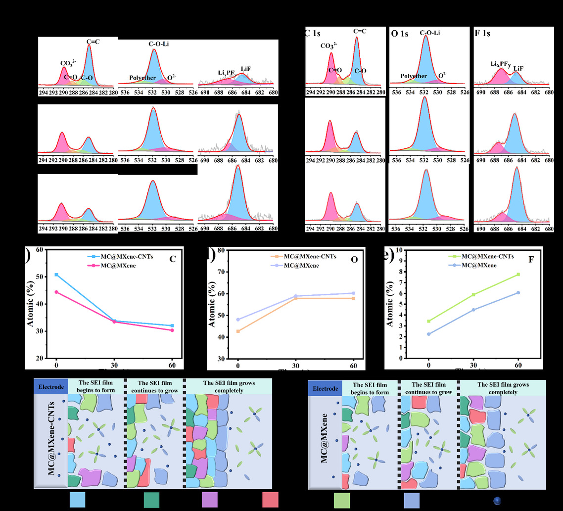 图2(a,b)MC@MXene-CNTs和MC@MXene电极循环后的C1 s、O1 s和F1 s XPS深度刻蚀光谱;(c-e)不同蚀刻时间下的C、O和F的元素含量;(f,g)MC@MXene-CNTs和MC@MXene电极SEI成分分布示意图